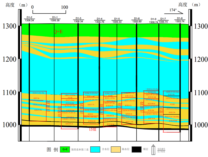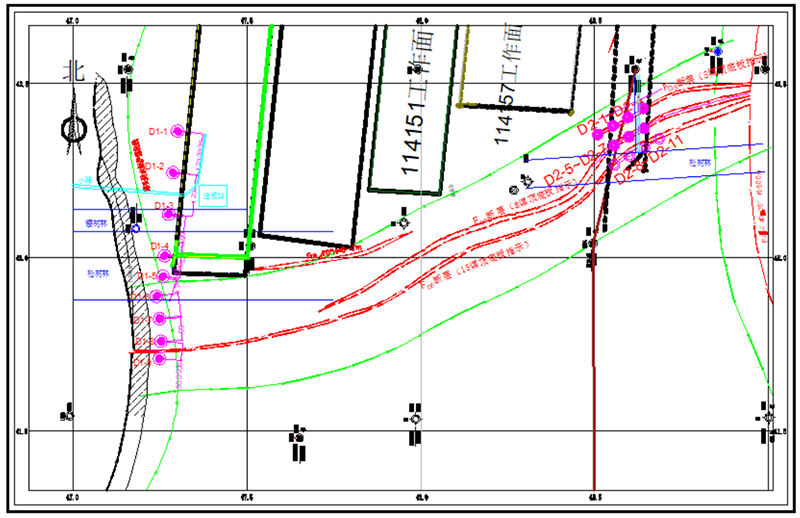 紧密配合煤矿生产及防治水工作的迫切需要,本次工作的重点是先施工D1钻孔组对FD5断层以北114155工作面上顺槽与露头煤柱线之间平面区域内的15煤顶板100m范围内砂岩含水层进行超前治理,共9个钻孔。为矿井防治水提供基础地质、水文地质依据。