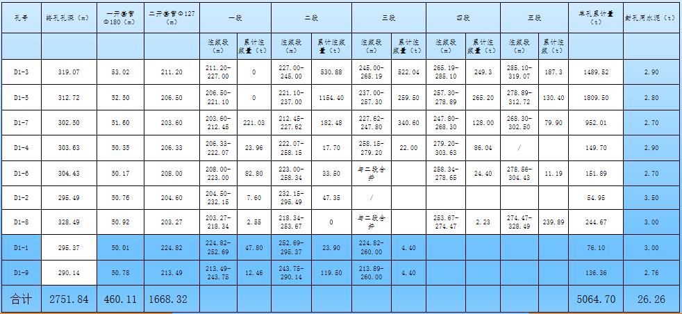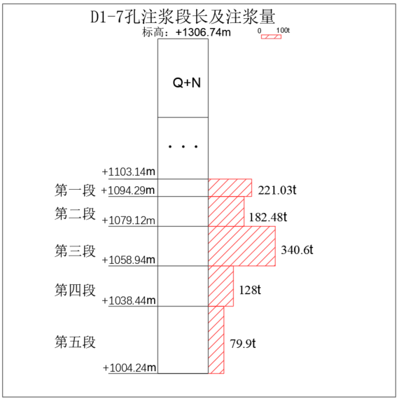 根据设计方案开展帷幕注浆治理,施工了9个钻孔,D1-1孔注浆71.7t;D1-2孔注浆57.95t;D1-3孔注浆1492.52t;D1-4孔注浆152.6t;D1-5孔注浆1812.3;D1-6孔注浆152.6t;D1-7孔注浆954.71t;D1-8孔注浆247.67t;D1-9孔注浆134.96t,注浆共计使用水泥5064t。
