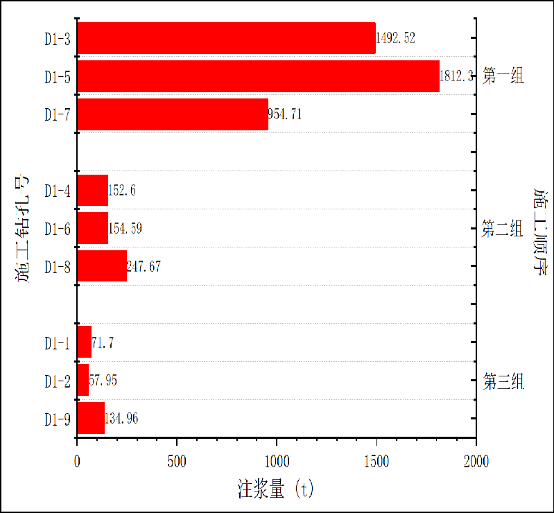 在施工中严格按照施工顺序,首先施工D1-3,D1-5,D1-7钻孔,根据这3个钻孔进行预先注浆试验,确认治理区域目标含水层的富水性、FD5断层导水性与断层注浆治理可行性;第二步施工D1-4,D1-6,D1-8钻孔;最后施工D1-1,D1-2,D1-9钻孔完成连排隔水帷幕的建立。如图所示,注浆量随着注浆顺序明显降低,注浆效果明显。