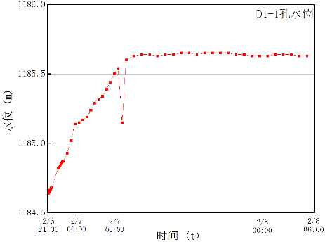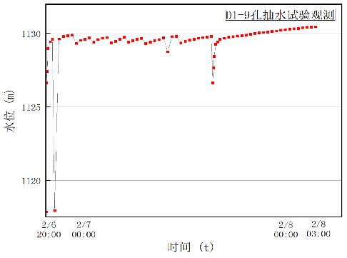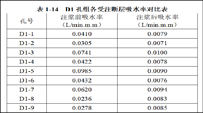 各孔各段的注浆终压终量、注浆后通过压水试验测得的单位吸水率等达到注浆结束标准。对D1-9检查孔进行抽水试验,均无水,表明富水性极弱,周围观测孔D1-1、B-13水位不降反升,不受抽水试验影响;随施工顺序钻孔注浆量明显降低,表明注浆效果达到预计要求。